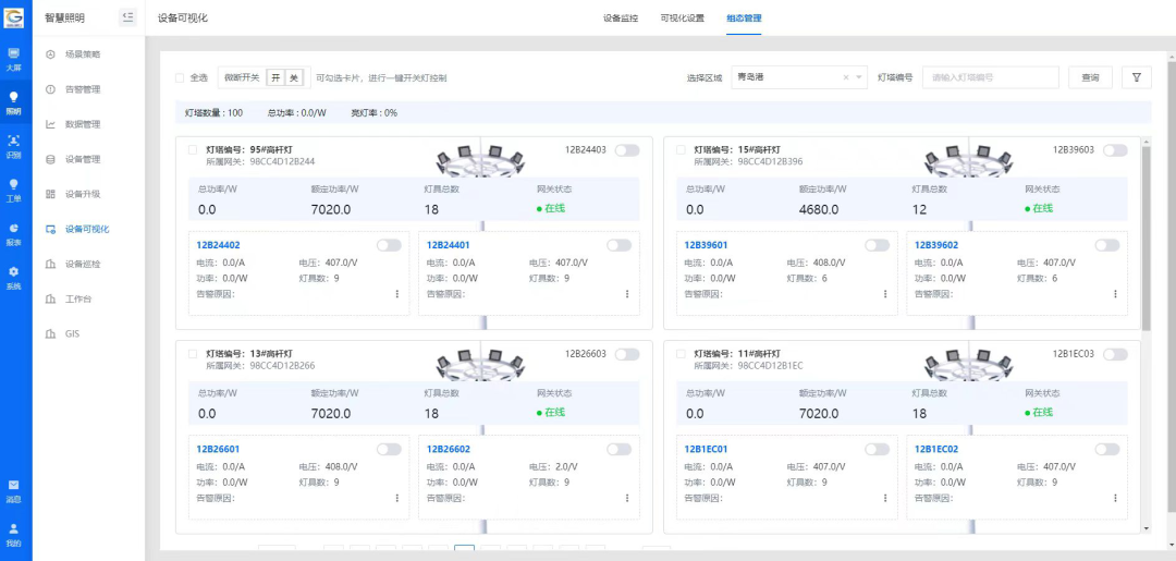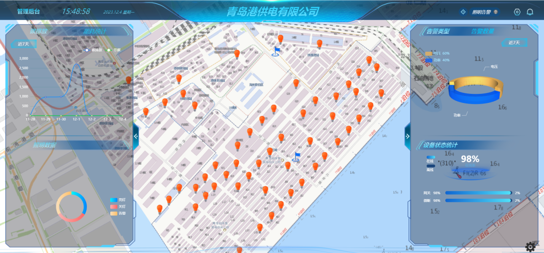 該項(xiàng)目基于港區(qū)內(nèi)需要維護(hù)的照明設(shè)施點(diǎn)多面廣分布特點(diǎn),將人機(jī)操作、遠(yuǎn)程控制、終端響應(yīng)等環(huán)節(jié)相結(jié)合,在每個(gè)變電站搭建集控中心,采用智能化無(wú)線(xiàn)控制技術(shù),對(duì)照明設(shè)備進(jìn)行遠(yuǎn)距離智能控制,從而實(shí)現(xiàn)對(duì)燈具的遠(yuǎn)程控制、分組控制、故障報(bào)警、壽命監(jiān)測(cè)、故障預(yù)判、按需亮燈、數(shù)據(jù)采集、報(bào)表分析等多種功能,確保隨時(shí)掌握管轄范圍內(nèi)照明設(shè)施運(yùn)行狀態(tài)的效果。